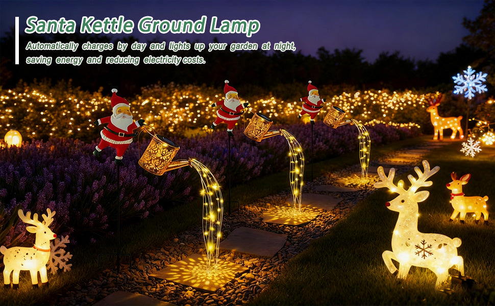 Featuring a delightful kettle shape with Santa Claus decoration, these christmas solar kettle lights tell a festive story of "Santa pouring holiday cheer." Adds a playful, narrative touch to your outdoor holiday decorations